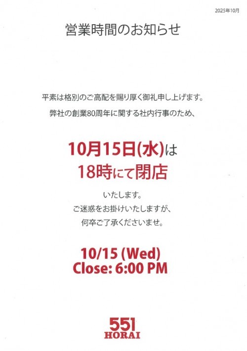 非常感谢您平日以来对本馆的使用。 非常抱歉,在551蓬莱,10月15日(星期三)的营业时间将变更如下。 营业时间:9点~18点 另外,详情请向各店铺咨询。 给客人带来不便,希望您能理解。
